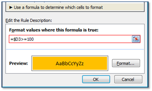- In the Edit the Rule Description section, click in the Format values where this formula is true, field, then type or select the first criteria value, the donation in cell D3, followed by the criteria, ‘>=100’ (no quotes).