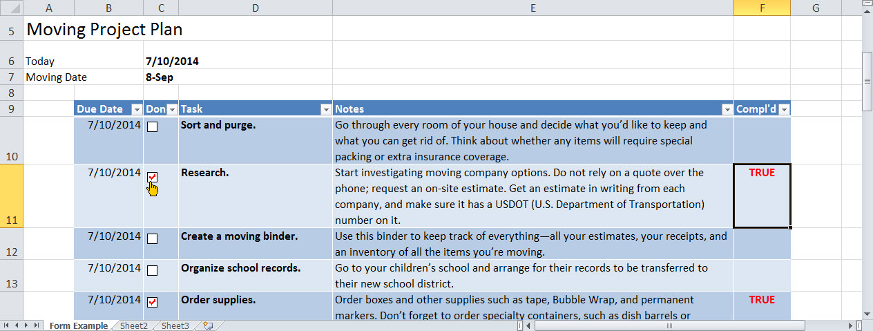 - Link the Check Box to the cell above: Right + Click on the Check Box, select Format Control, and enter above cell in the Cell link field (for more detailed instructions click here ). Repeat for each Check Box.