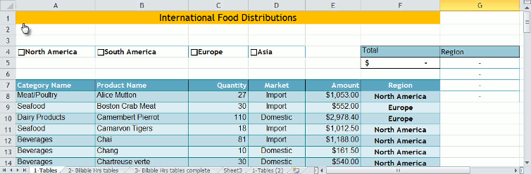 - In the second blank row, add Check Box Form controls for each criteria value to be included in the summary. In the example depicted, we created Check Boxes for each region (see Adding a Check Box for instructions).